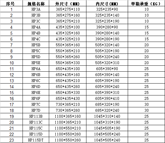 HP系列标准箱是本田汽车公司推广使用的标准物流箱。本系列产品周转便捷、堆垛整齐、便于管理,同时又具有耐油、耐酸碱、适应环境温度广(-25°C----+60°C)等优点,因而适用于企业物流中的仓储、流通、加工制造等闭环回路配送系统。主要使用于本田汽车主机厂及其配套单位。